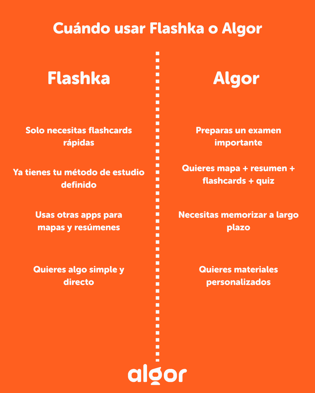 Si solo necesitas flashcards, Flashka puede ser suficiente. Pero si preparas un examen y quieres entender, memorizar y verificar tu conocimiento, el enfoque de Algor es más completo.
