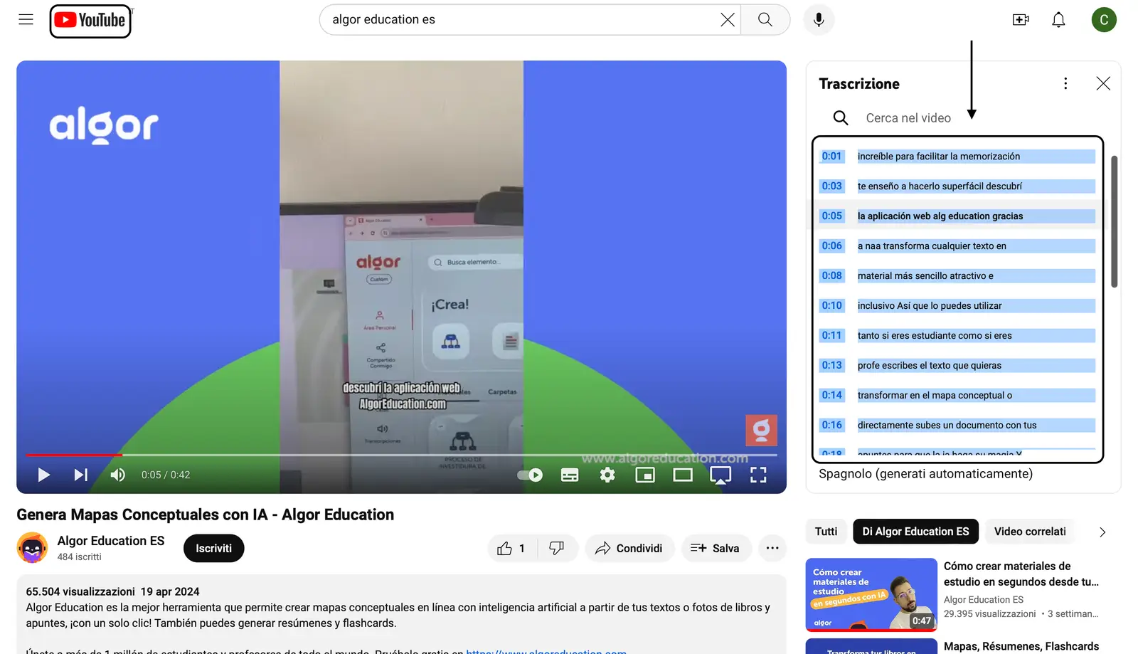 Los pasos a seguir en Algor son muy sencillos: solo tienes que encontrar el video que te interesa y seleccionar la opción de la transcripción automática en la descripción del video de Youtube. El texto del video aparecerá en el lado derecho y después de haberlo copiado, solo tendrás que pegarlo en la simple interfaz de algoreducation.com en el cuadro de la función ‘Desde texto’. De esta manera, obtendrás todo el conjunto de tipos de resumen proporcionados por Algor y podrás incluso hacer frente a los desafíos o eventuales limites relacionados con la descarga de determinados contenidos.
