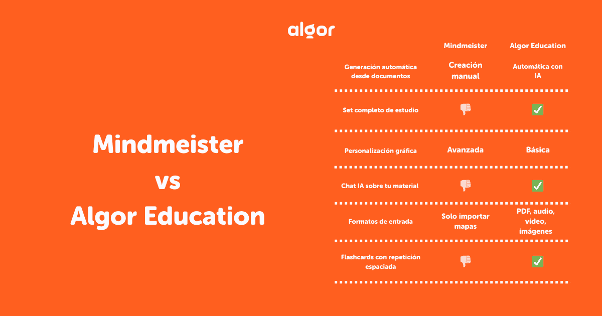 La diferencia es especialmente notable cuando tienes mucho material que procesar. Con MindMeister, cada hora que dedicas a crear mapas es una hora que no estás estudiando. Con Algor, la generación es automática y puedes dedicar ese tiempo a repasar y aprender. Si quieres aprender cómo hacer un mapa mental efectivo para estudiar, visita nuestra guía completa.